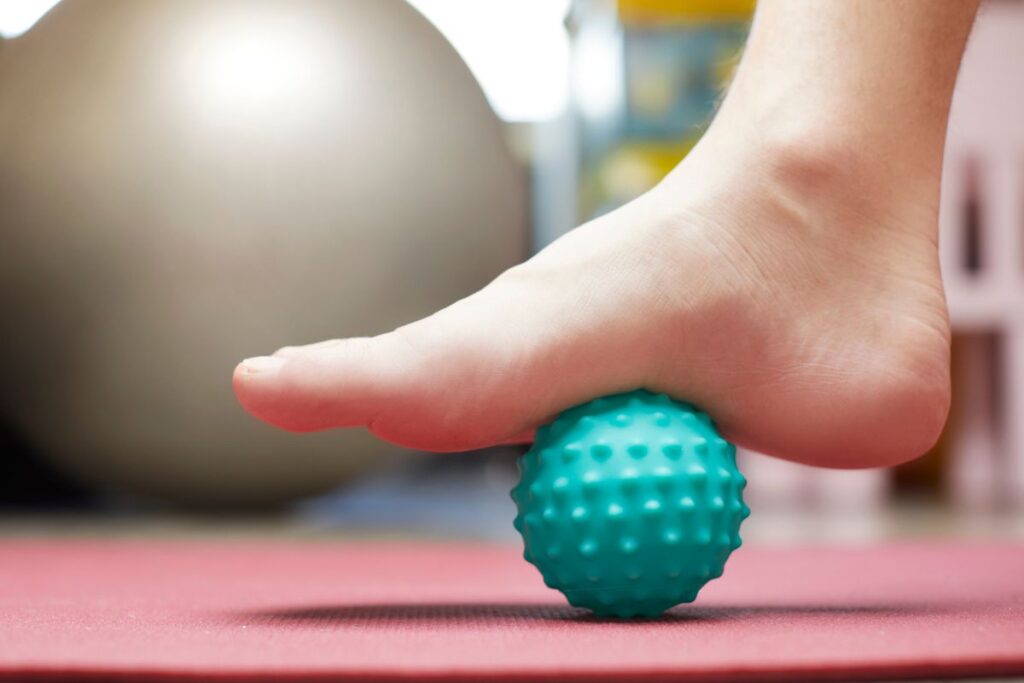 - Masaż stóp: Usiądź wygodnie na krześle, umieść piłkę pod stopą i przesuwaj ją w różnych kierunkach, aby masować podeszwę. Wykonuj to ćwiczenie przez 1-2 minuty na każdą stopę.