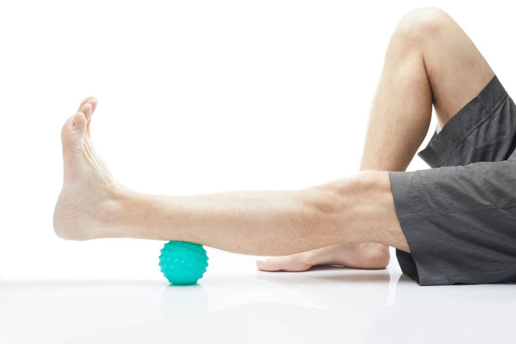 - Masaż łydek: Połóż się na podłodze, nogi zgięte w kolanach. Umieść piłkę pod łydką, a drugą nogę połóż na górze, aby zwiększyć nacisk. Przesuwaj piłkę wzdłuż łydki, koncentrując się na obszarach napiętych. Wykonuj to ćwiczenie przez 1-2 minuty na każdą łydkę.